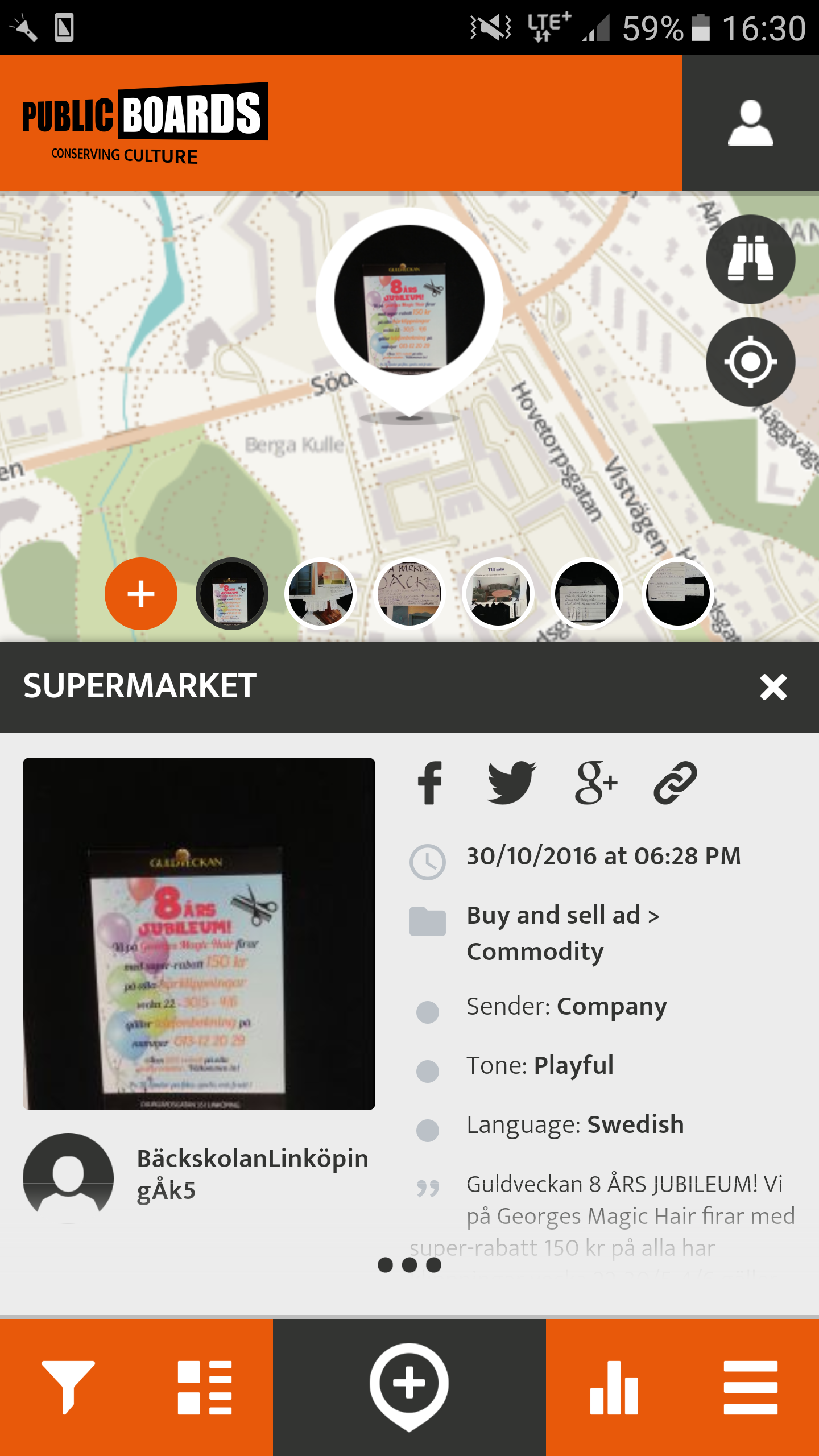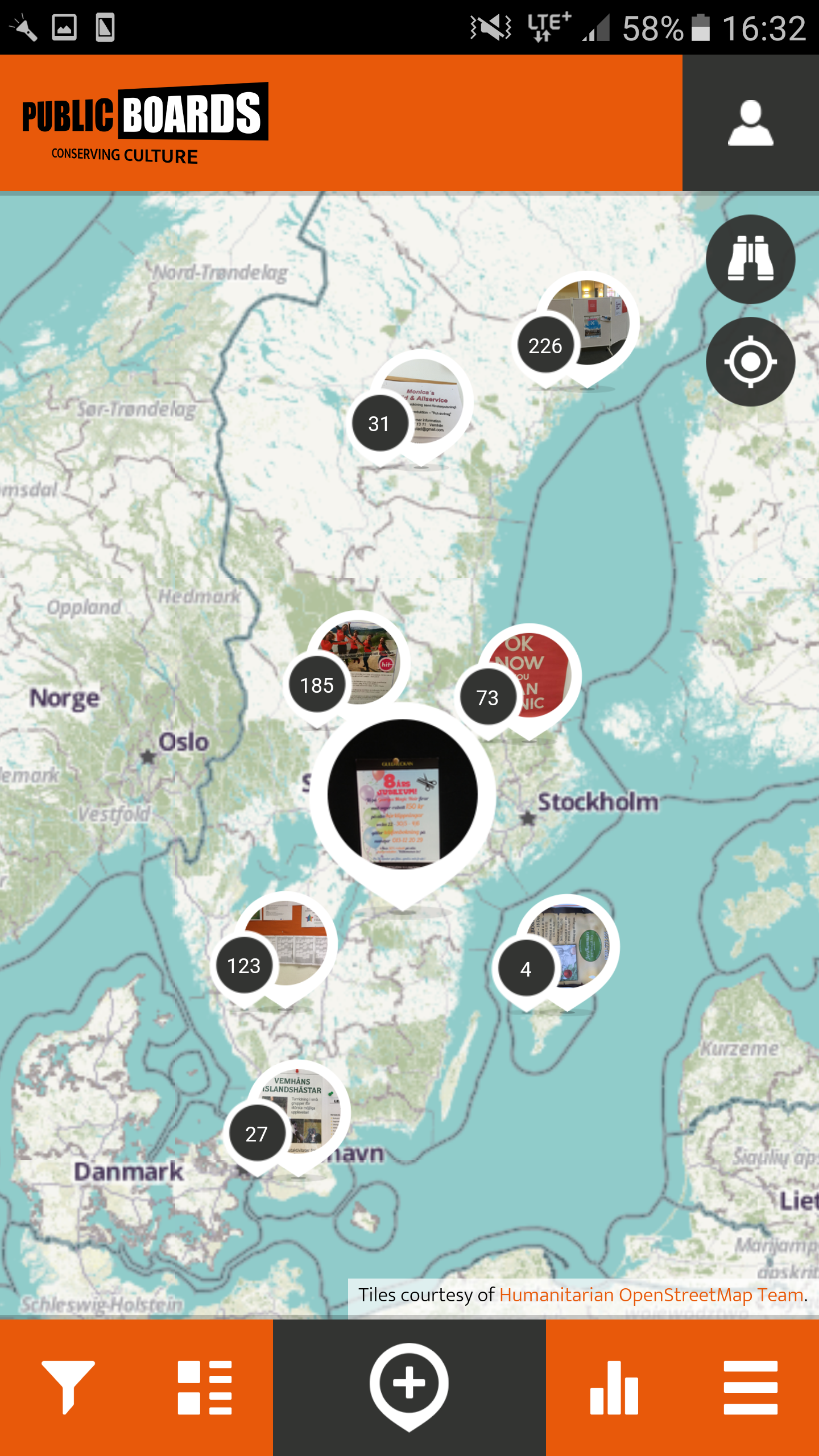 This collaboration between Vetenskap och Allmänhet (Science and general public), the University of Gothenburg, University of Stockholm and the European Researcher's Night resulted in a collection of more than 1500 pictures of public boards from all over Europa and some cases even the world. This community generated collection enabled the scientists to research how public boards, pictures and languag are used for spreading information. The project even won the Open Knowledge Award.