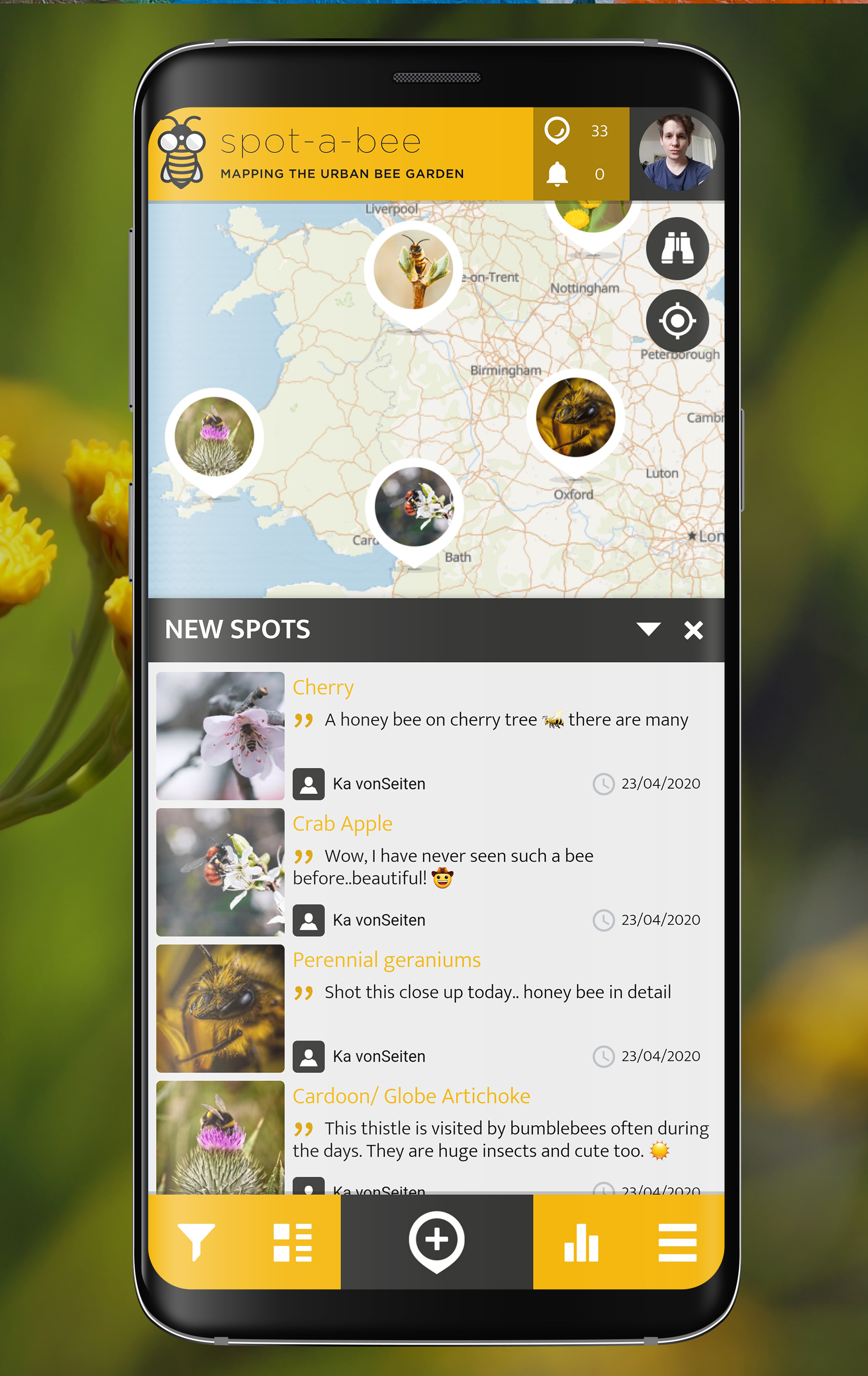 The Spot-A-Bee app allows you to observe and document any flowers, shrubs, climbers or trees and the bees on them. Additionally, it contains useful information on those plants and the most common bee species in the UK.