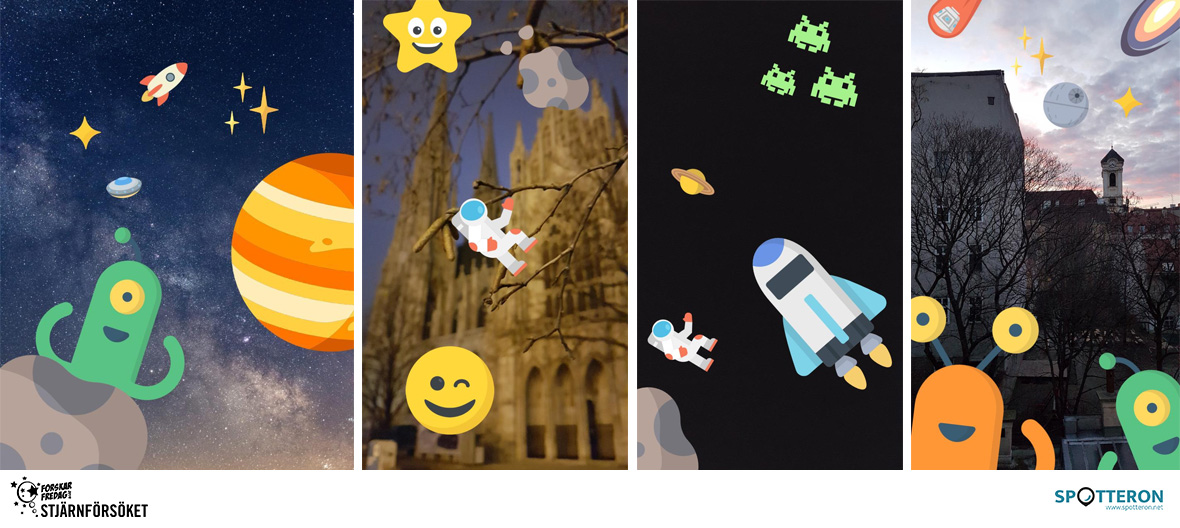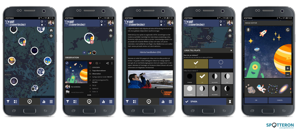 The image editor in Stjärnförsöket features a set of 36 cool sticker images, which can be placed in the photographs of the dark night sky in a way every smartphone app user is already familiar with from chat apps like Signal, WhatsApp or from social media platforms like Instagram or Facebook. These stickers greatly improve the uniqueness of the spots and add a new level of fun to participating in a Citizen Science project. Here are some creations from the test phase: