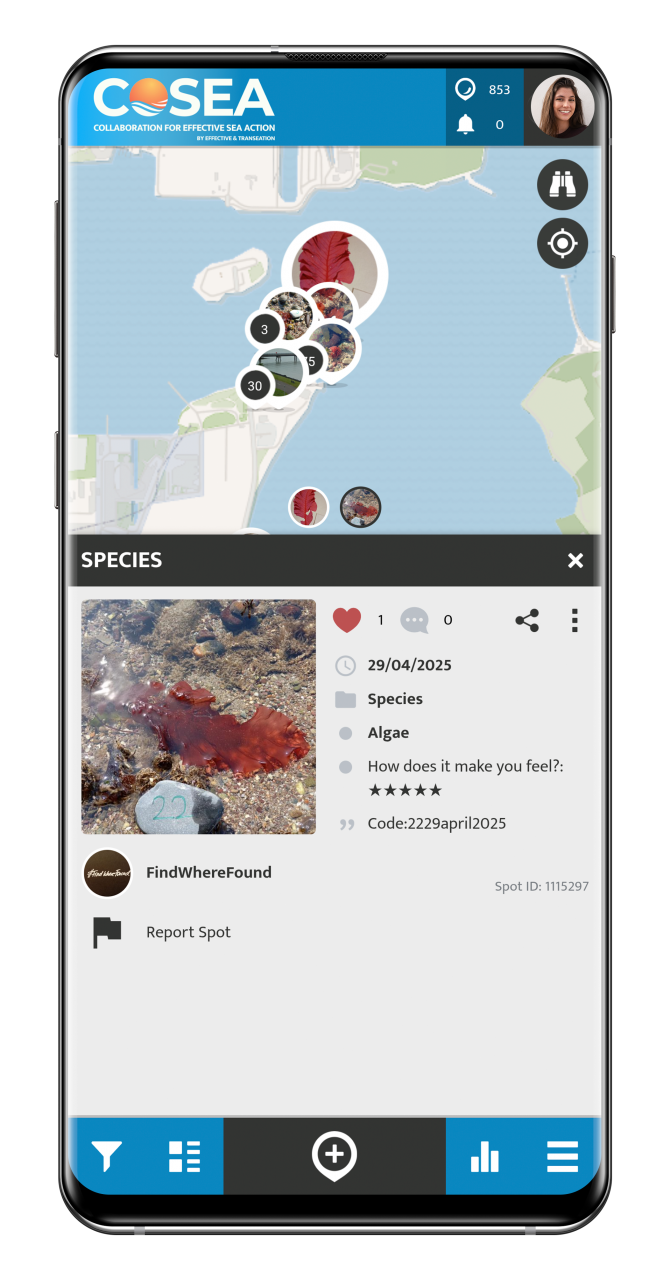The name #FindWhereFound represents the idea that the viewer can find the exact place the seaweed was found. Each specimen's information is linking the exact location at which the specimen was collected with a QR Code on a digital map, which is part of the "COSEA" Citizen Science open platform for collaboration of marine and coastal community projects running on SPOTTERON.