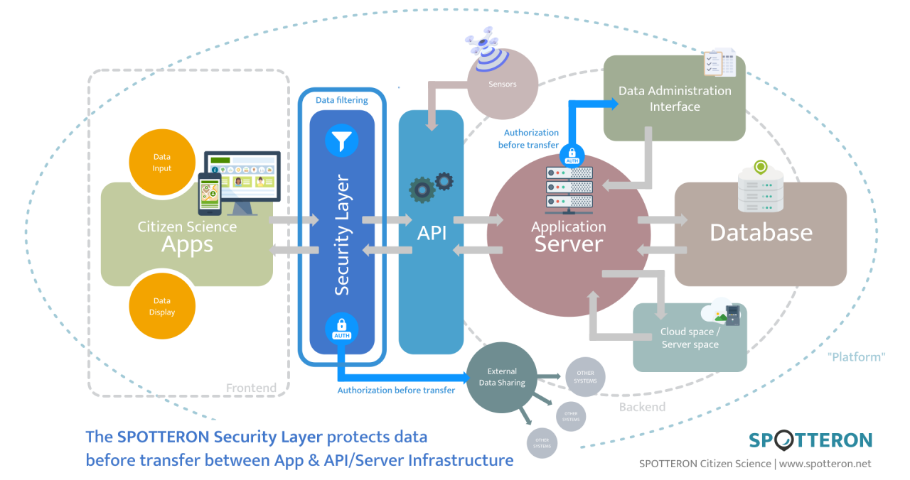 From Data Input to Data Display both in the Citizen Science Apps and the Data Administration Interface — the Security layer takes care of transfer authorization and of data filtering to only enable data availability for authors, moderators, and administrators.