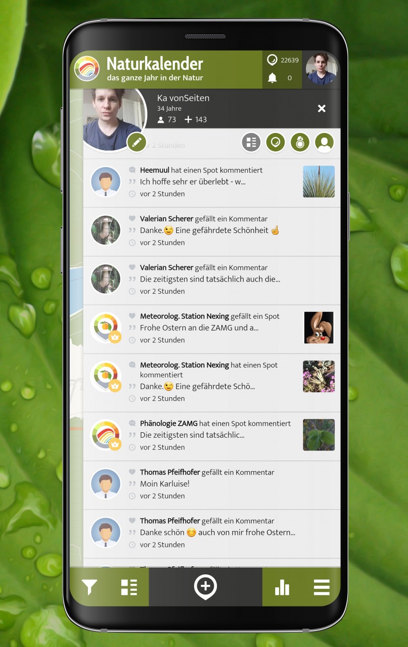 Die zentrale Anlaufstelle für alle Aktivitäten in einer Citizen Science App ist der personalisierte "Benachrichtigungs-Feed", der chronologisch alle Aktivitäten der befreundeten Nutzer:innen und des Projekts auflistet. Da eine Community-basierte Citizen Science App ein lebendiger Ort sein soll, werden neue Aktivitäten live in der App oder über Push-Benachrichtigungen hervorgehoben.