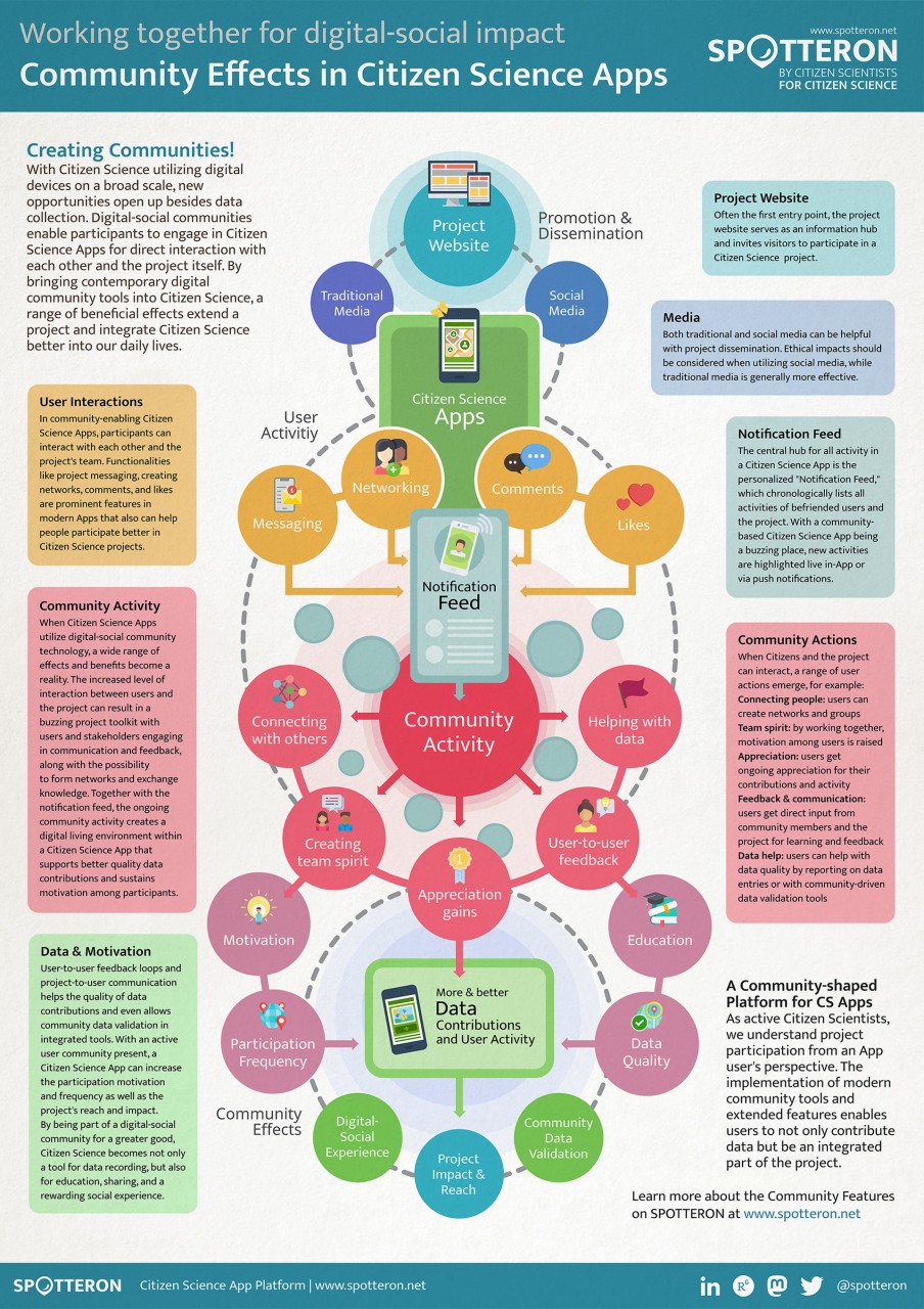 Wenn Citizen Science Apps die digital-soziale Community-Technologie nutzen, wird eine breite Palette von Effekten und Vorteilen möglich. Das erhöhte Maß an Interaktion zwischen Nutzer:innen und dem Projekt führt zu einem lebendigen Projekt-Toolkit, wo Nutzer:innen und Stakeholder sich in Kommunikation und Feedback engagieren, sowie die Möglichkeit haben, Netzwerke zu bilden und Wissen auszutauschen.