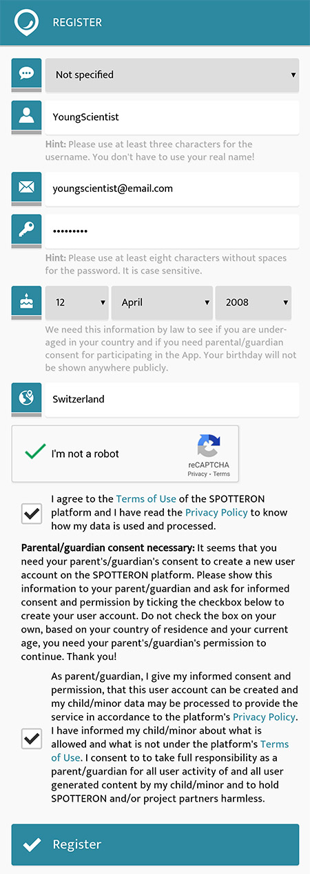 Auf SPOTTERON können nun alle Citizen Science Projekte die jüngere Generation bequem und offiziell in ihre Apps einbinden. Gemeinsam mit dem EU Horizon Projekt "YouCount" haben wir ein umfassendes System für die Registrierung von Nutzerkonten entwickelt, um nationale Altersgrenzen und die Zustimmung von Eltern und Erziehungsberechtigten einzuhalten.