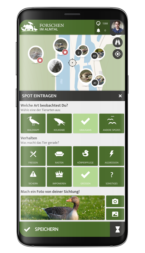 Ziel des Projektes ist das Monitoring der Zeit-Raum Muster von drei Modell-Vogelarten (Graugänse, Raben und Waldrappe), welche aufgrund ihrer Verfügbarkeit und Zugänglichkeit im Studiengebiet (Cumberland Wildpark, Grünau im Almtal, OÖ), sowie des Interesses, welches ihnen die Öffentlichkeit entgegenbringt, sich perfekt für das Vorhaben eignen. Die Individuen sind individuell markiert, was eine einfache Erkennung der Einzeltiere im Feld auch für Citizen Scientists erlaubt.