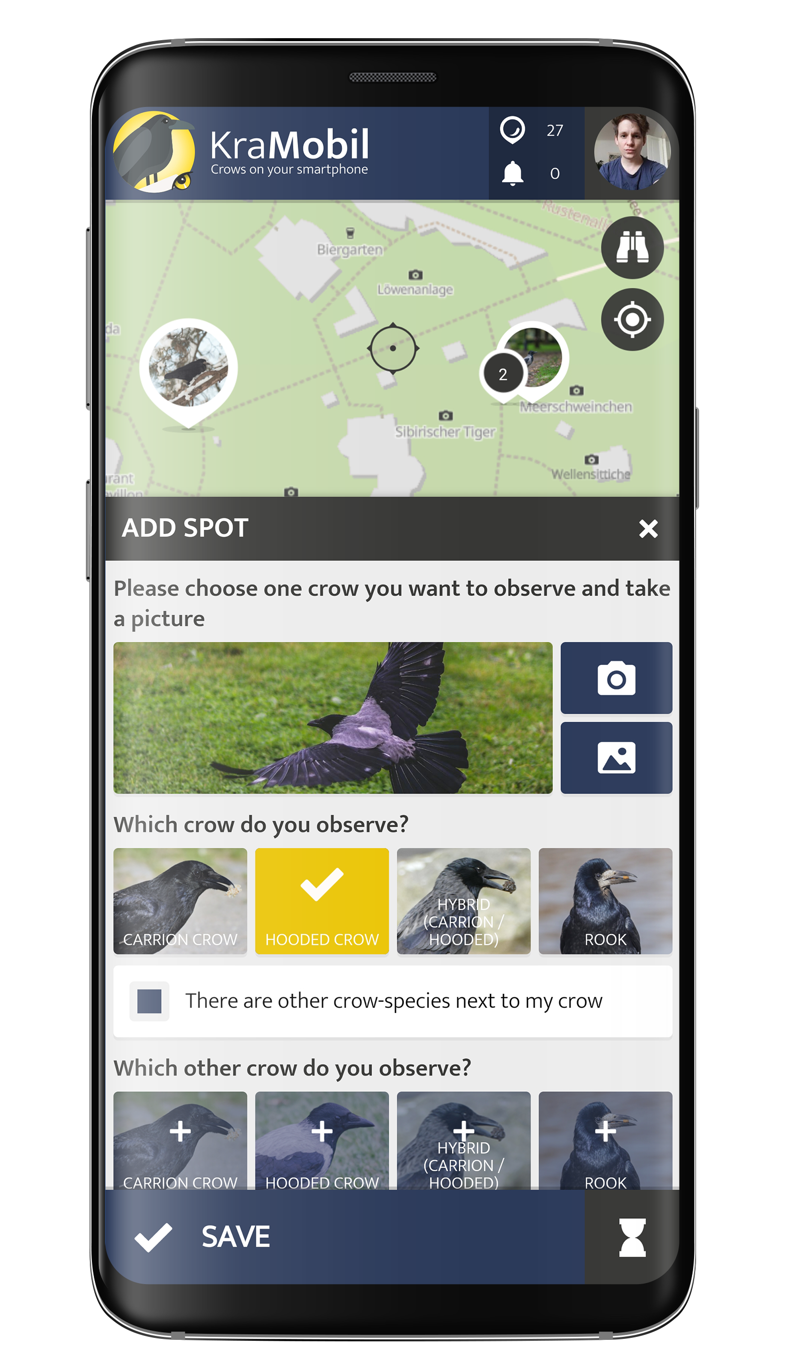 Mit der App können verschiedene in Mitteleuropa heimische Krähenunterarten und deren Verhalten wie Futtersuche, Aggression, Zuneigung und mehr beobachtet werden, und so spannende Fakten über diese faszinierenden Vögel gewonnen werden.