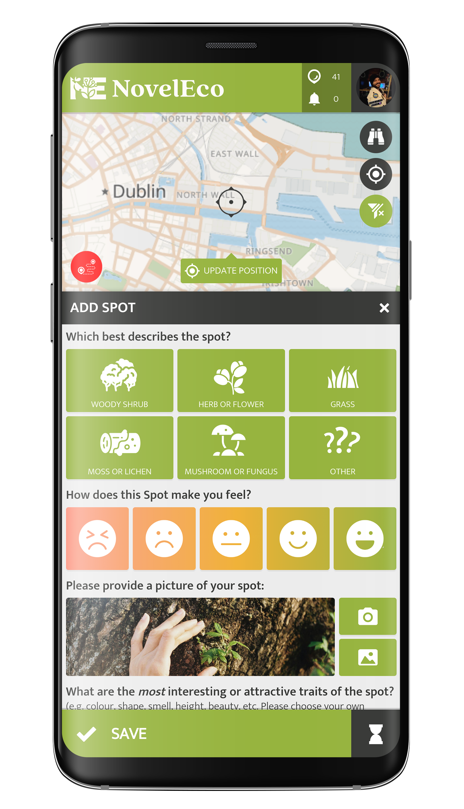 Die NovelEco-App ermöglicht es den Teilnehmer:innen, Daten über Pflanzen und andere Elemente, die sie in städtischen Wildnisgebieten antreffen, aufzuzeichnen und hochzuladen, einschließlich Pflanzen, die in verlassenen oder wenig genutzten Gebieten wachsen. Diese Citizen-Science-Initiative lädt die Nutzer:innen ein, ihre Entdeckungen auf benutzerfreundliche und leicht zugängliche Weise zu dokumentieren und zur Erforschung dieser neuartigen Ökosysteme beizutragen, um eine umfassende Datenbank der städtischen Flora aufzubauen. Durch ihren Beitrag zu dieser Initiative fügen die Teilnehmer:innen wertvolle ökologische Informationen hinzu und beteiligen sich an einer breiteren Diskussion über die Rolle der Natur in städtischen Gebieten.