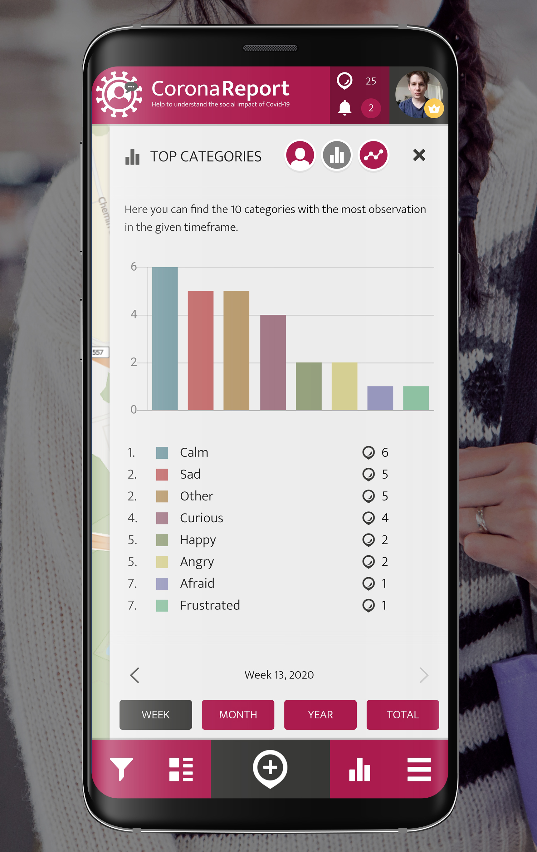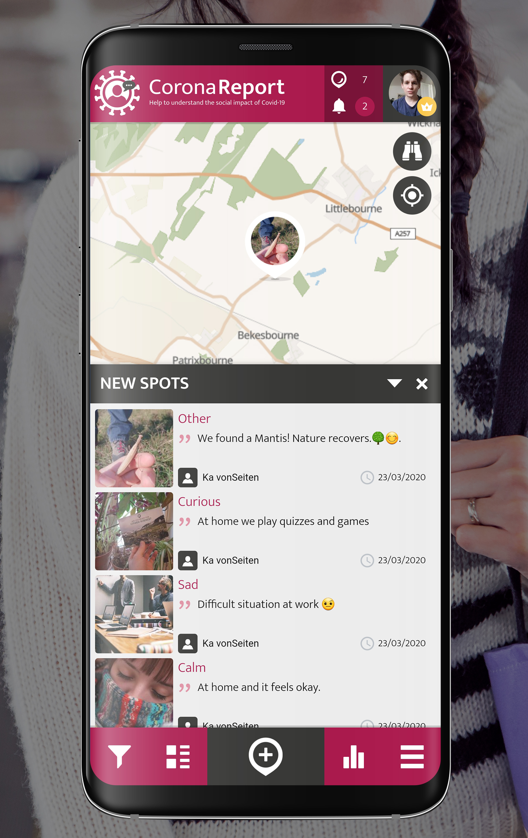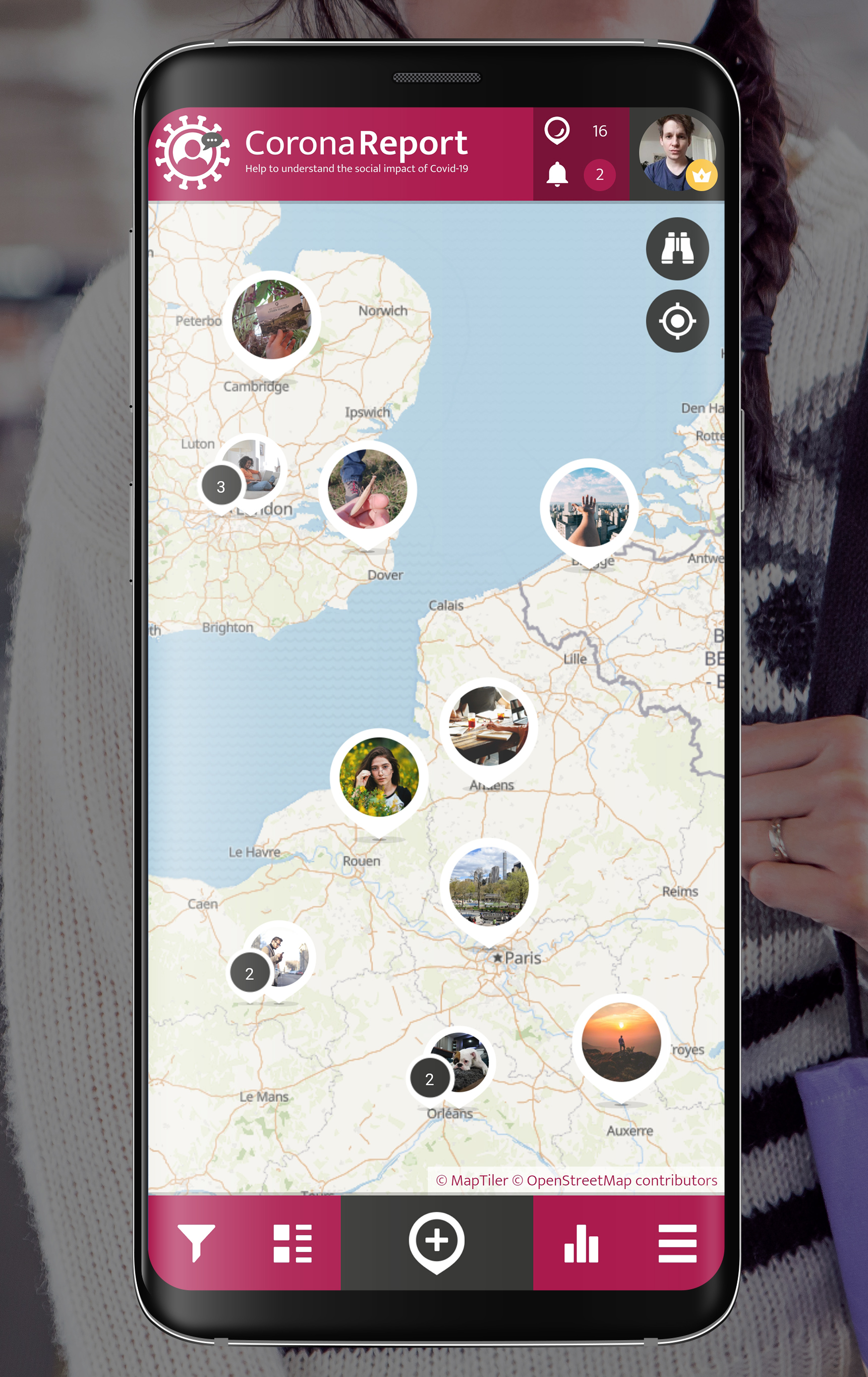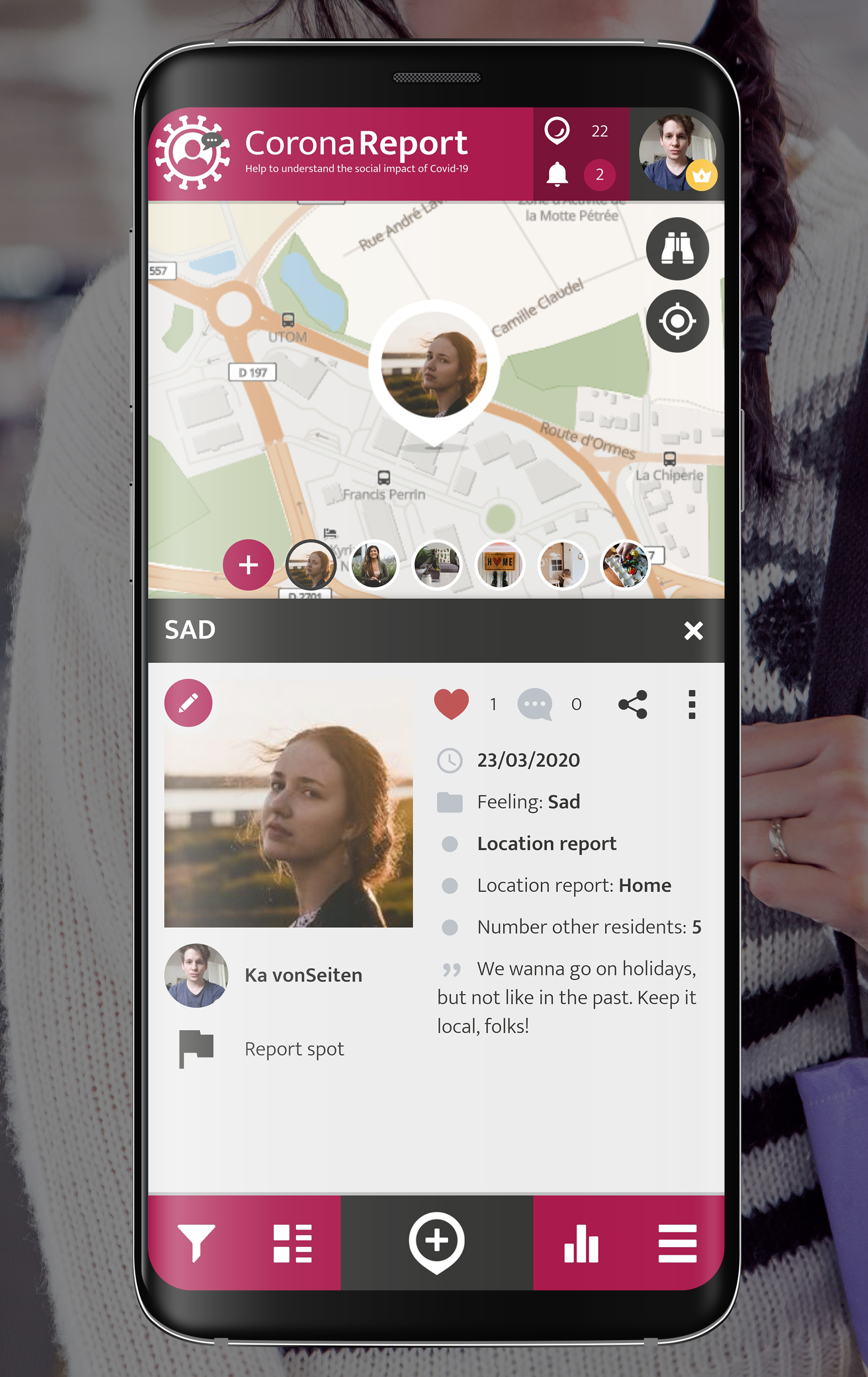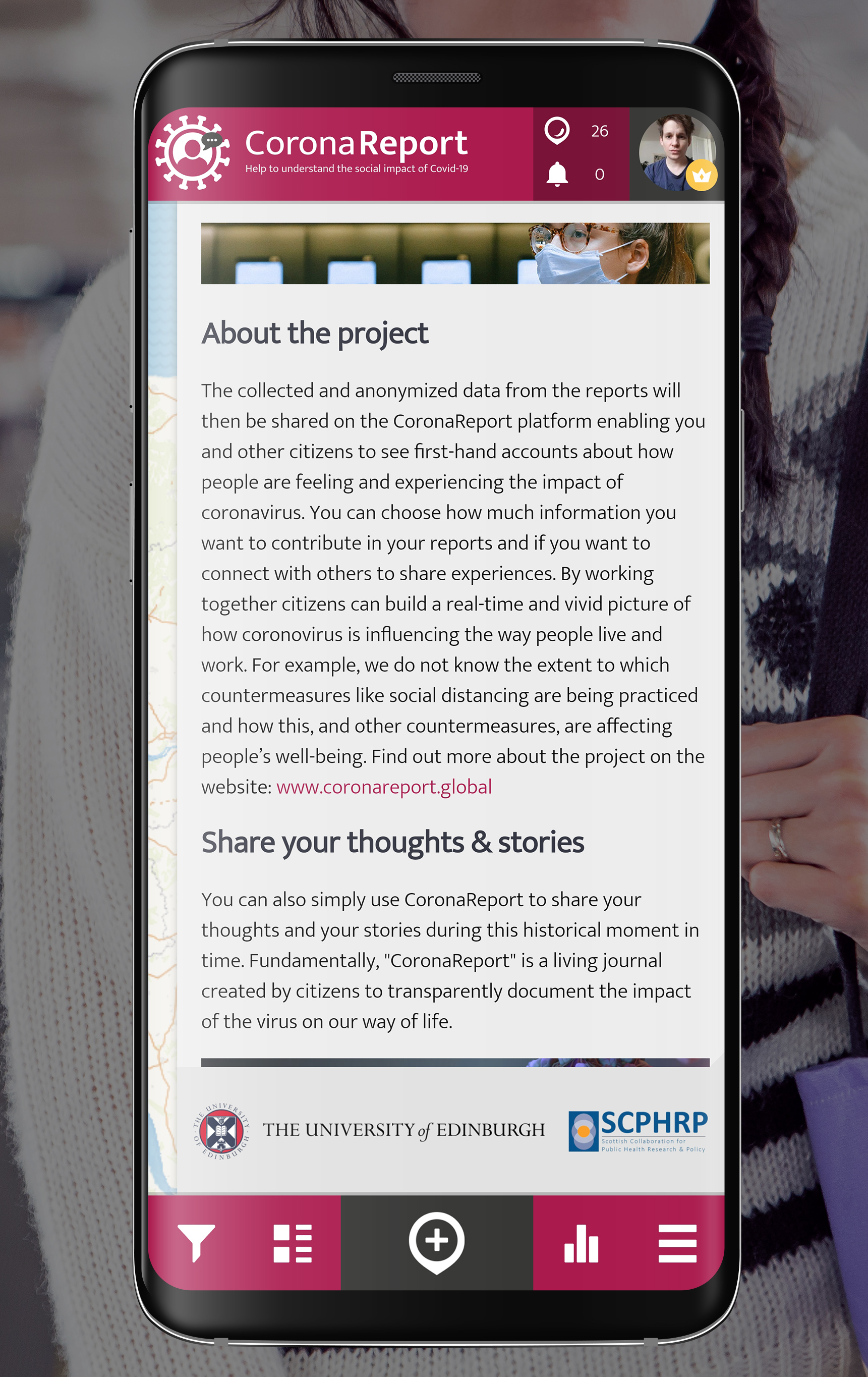 CoronaReport ist ein Citizen Science Projekt zur Dokumentation des Einflusses von COVID-19 auf unser Leben. Citizen Scientists können die CoronaReport-App verwenden, um ihre Geschichten zu teilen und so besser verstehen, wie die Krise das Leben auf der ganzen Welt verändert, und um Aufzeichnungen über ihre Alltagserlebnisse zu erstellen. Diese Daten helfen wiederum Wissenschaftlern zu verstehen, wie sich die COVID-19-Pandemie auf die Art und Weise auswirkt, wie Menschen leben und arbeiten. Weitere Informationen finden Sie auf der offiziellen Projektwebsite www.coronareport.eu