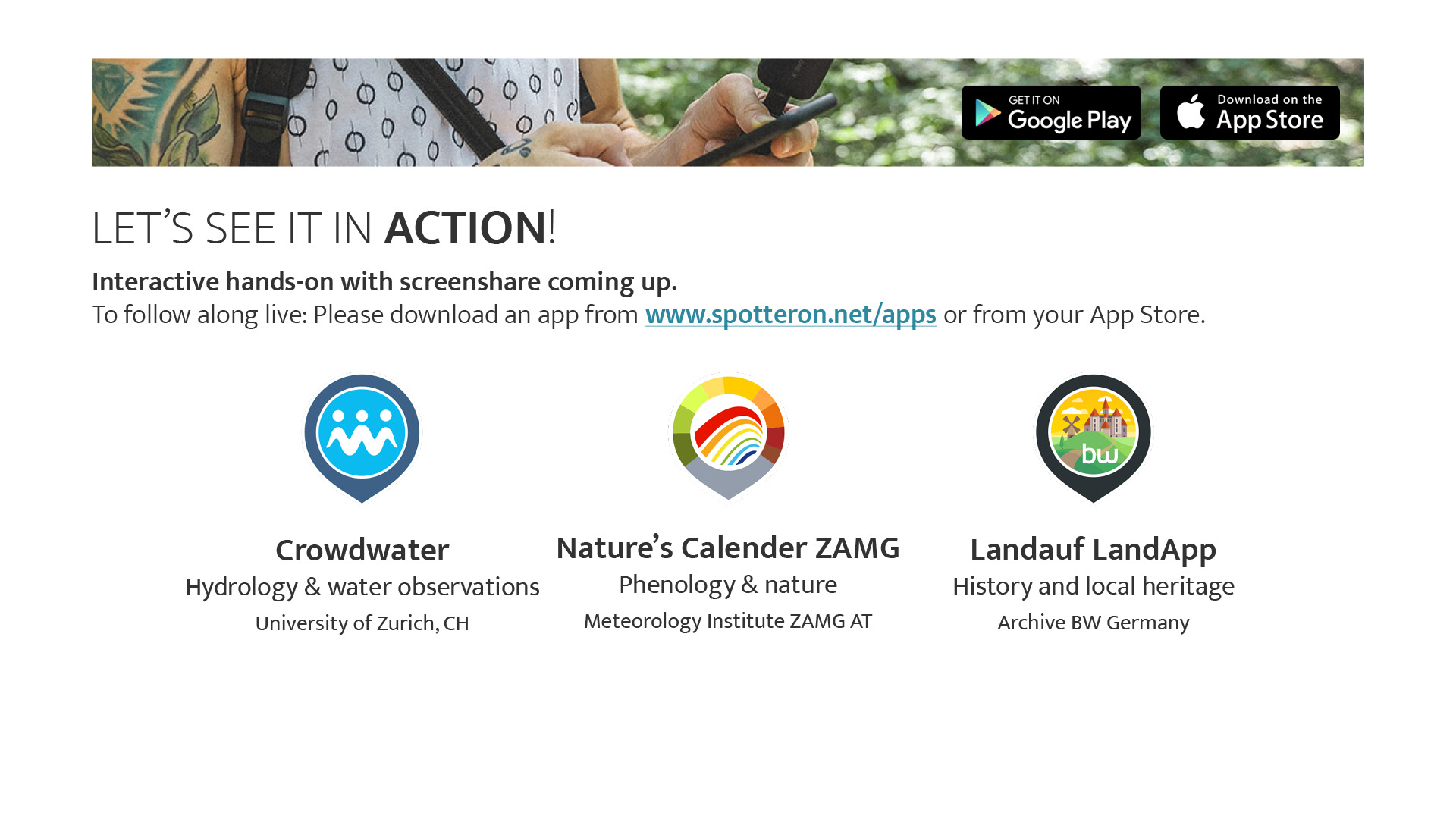 Sie können unsere Präsentation hier als PDF herunterladen: https://www.spotteron.net/images/downloads/232_02_Hummer_Philipp_CitSciTechDesign_v3_sharingversion_SPOTTERON.pdf oder die genannten Apps hier finden https://www.spotteron.app und gleich selbst ausprobieren!